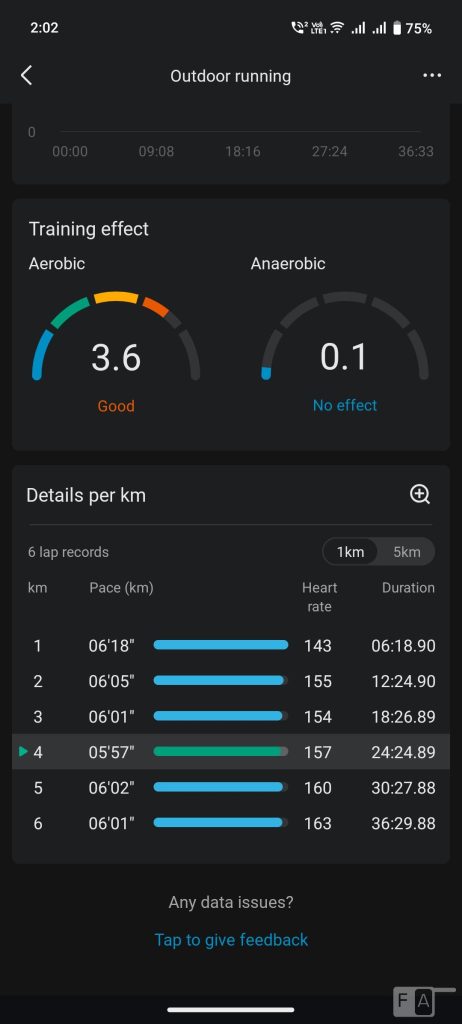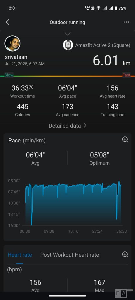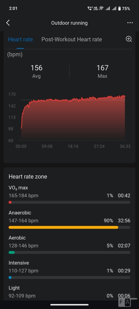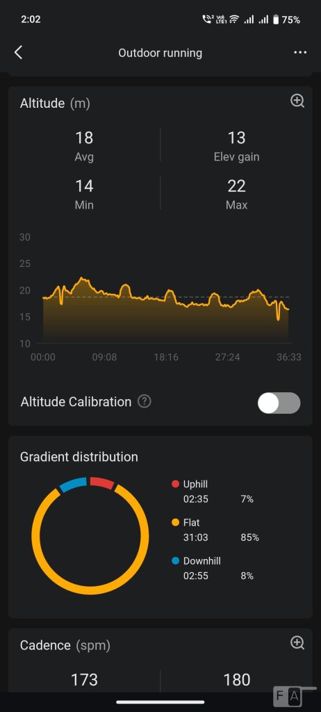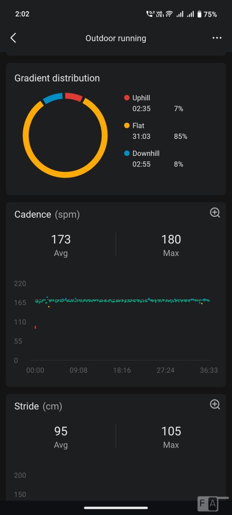 For outdoor activities, you get all the details such as distance, calories burnt, average heart rate, average speed, average pace, cadence, duration, power, power-to-weight ratio, altitude, gradient distribution, and stride You can also see VO2 Max, recovery period, heart rate zones and post-workout heart rate for outdoor activities such as running.