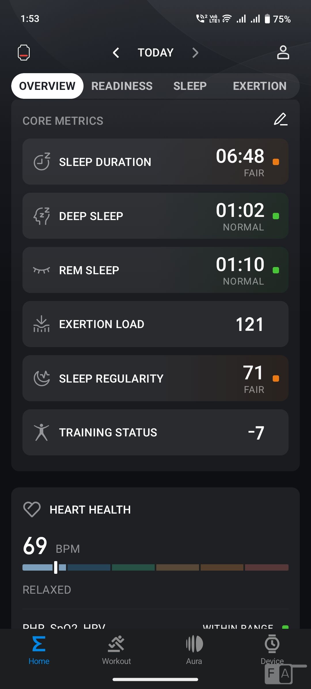 Swiping to the left shows Music Controls, Weather, Readiness, Alarm, Sleep, Heart rate, Activity, Zeep Flow, Recent calls, Weather, PAI and more. There is also an easy notification shade when you swipe from the bottom on the home screen. You can read the notifications and dismiss, but can’t reply.