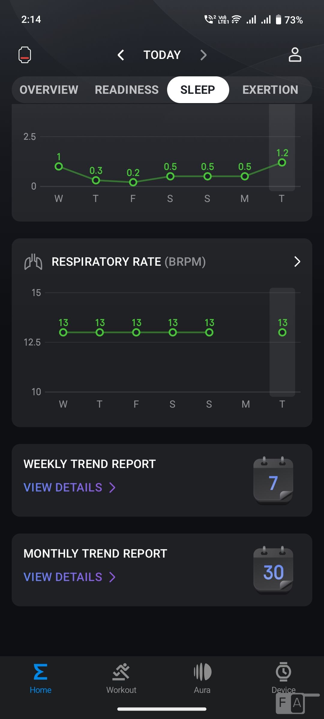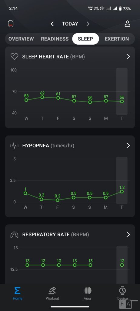 Sleep tracking shows light and deep sleep, awake time, as well as REM sleep. It shows respiratory rate, and also shows hypopnea, a sleep-related breathing disorder. Overall, the sleep data is good, and insightful.
