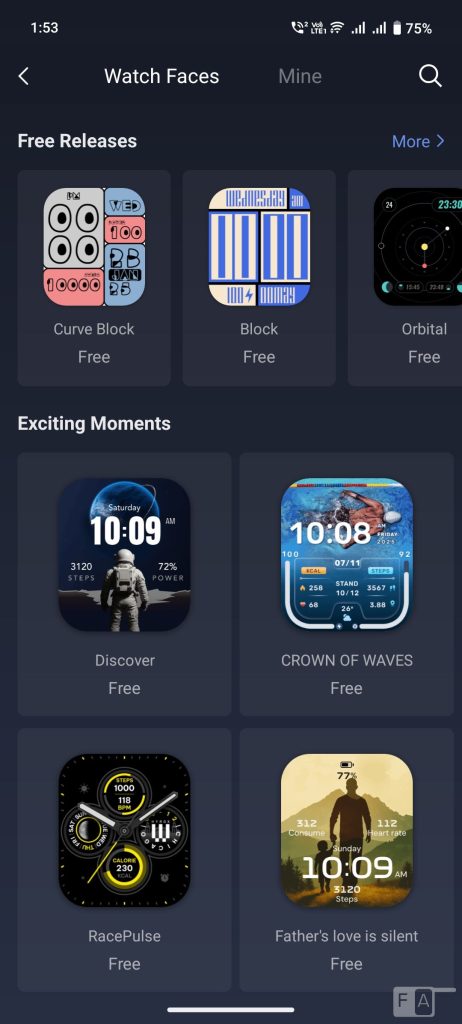 The face gallery shows 400+ different types of free watch faces, and there are also paid ones. There are some editable watch faces, and you can also choose 5 AOD watch face options directly from the watch. There is an option to upload photos to the watch face, and if you upload 3 photos to the watch, it will switch between them each time you wake up the display.