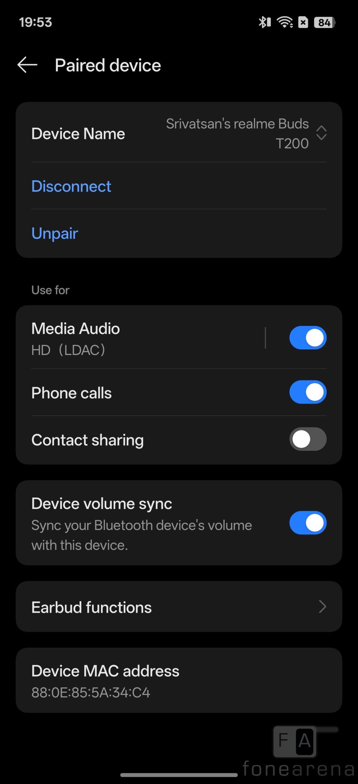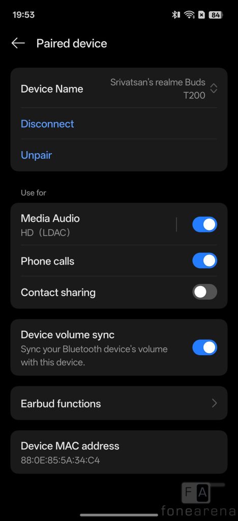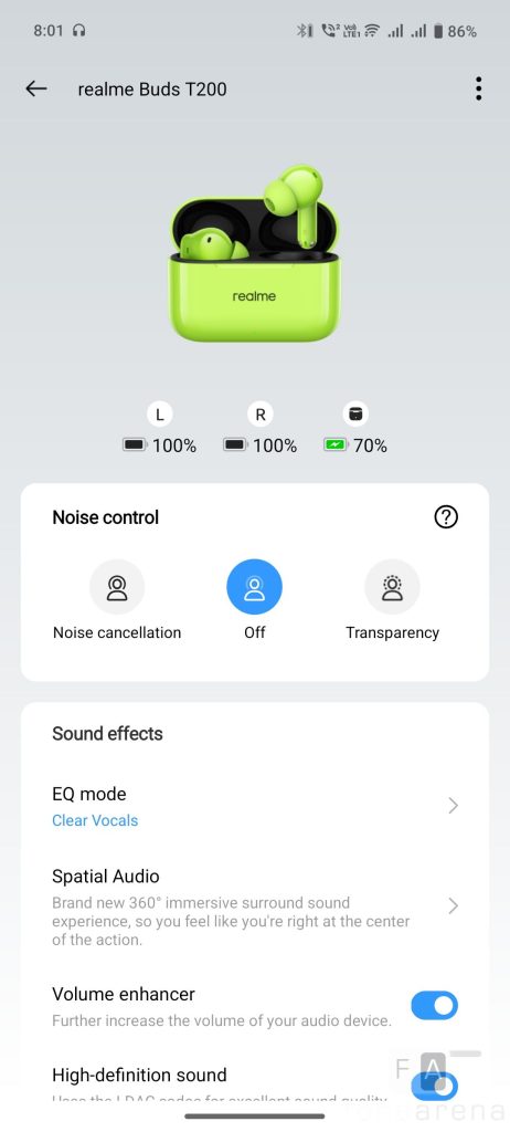 The realme Buds T200 supports Bluetooth 5.4 with LDAC Hi-res audio codec in addition to SBC and AAC codecs. The pairing process is very easy. Remove the earbuds from the case, press and hold the touch area on both earbuds for a few seconds to enter pairing mode. Now open the Bluetooth settings on the phone, and it shows up as realme Buds T200, and you can connect to it.