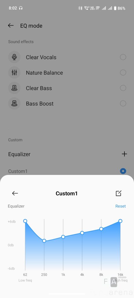 The realme Buds T200 packs a 12.4mm dynamic driver covering an ultra-wide frequency range of 20-40KHz. The bass driver offer clear audio output mainly tuned for bass with clear vocals, but you can use custom equalizer in the settings. Highs are good, but the mid-range is average.