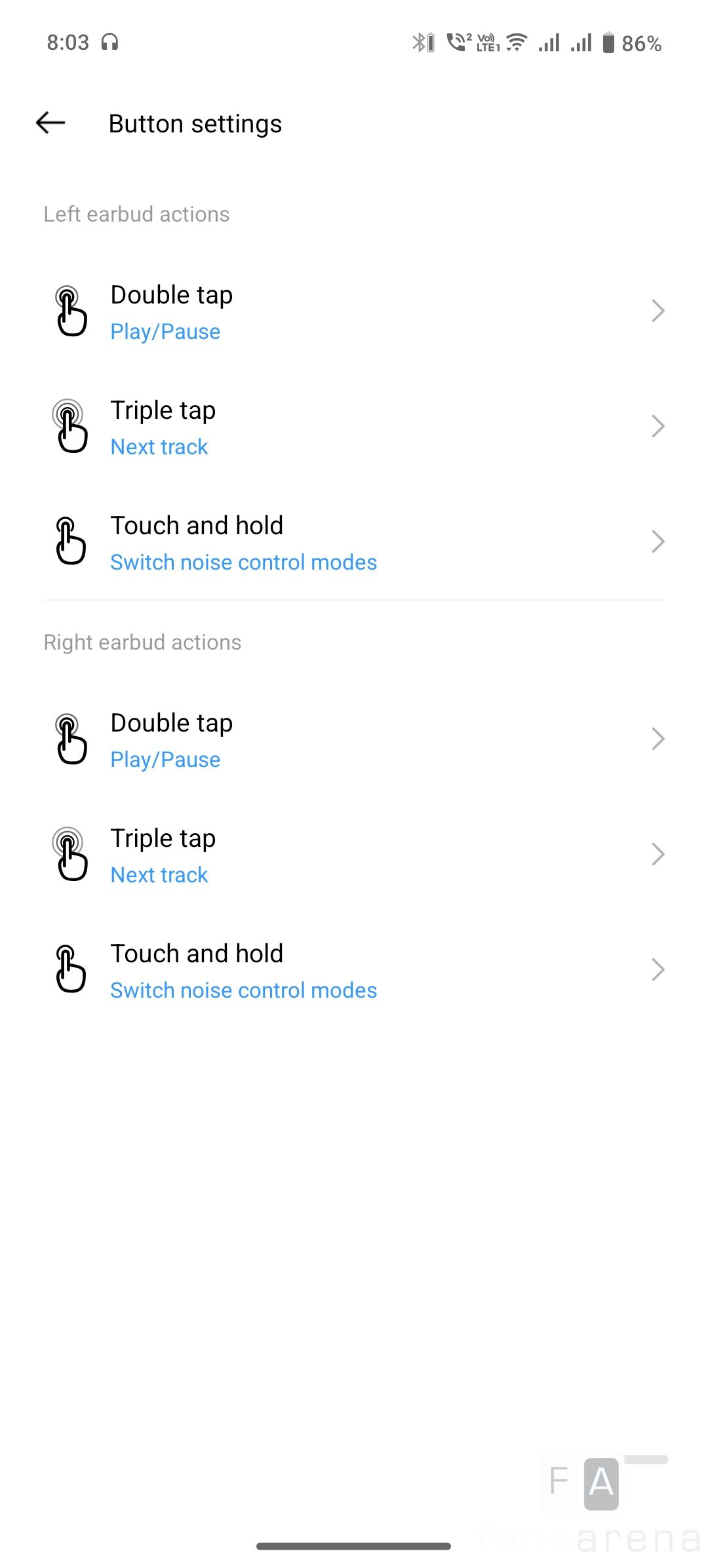 You can customize the controls from the settings in the realme Link app on Android and iPhone. You can change actions for the double tap, triple tap, and touch and hold. This also lets you control volume. The app also has Mindflow mode that plays white noise sounds. Camera control that works with compatible realme and other ColorOS-based phones.