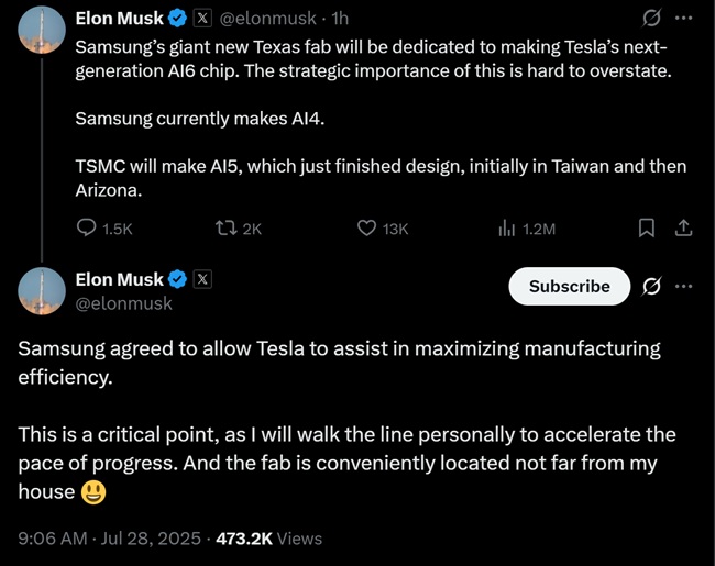 Tesla CEO Elon Musk has officially confirmed that his company is the previously unnamed client in Samsung Electronics’ multi-year chip making deal valued at over $16.5 billion. The agreement sets Samsung’s Texas foundry as the site for building Tesla’s next-generation AI6 processors.