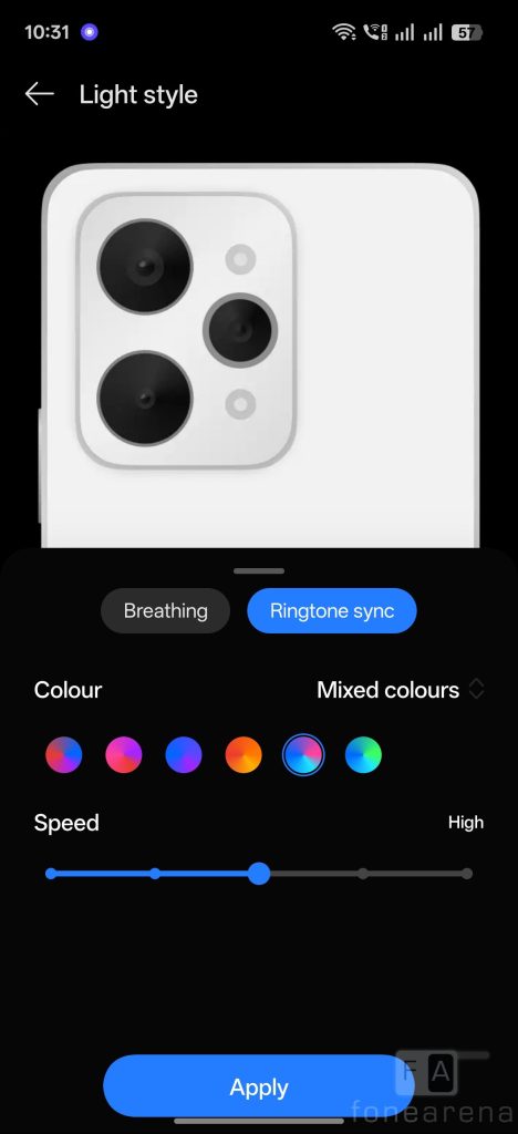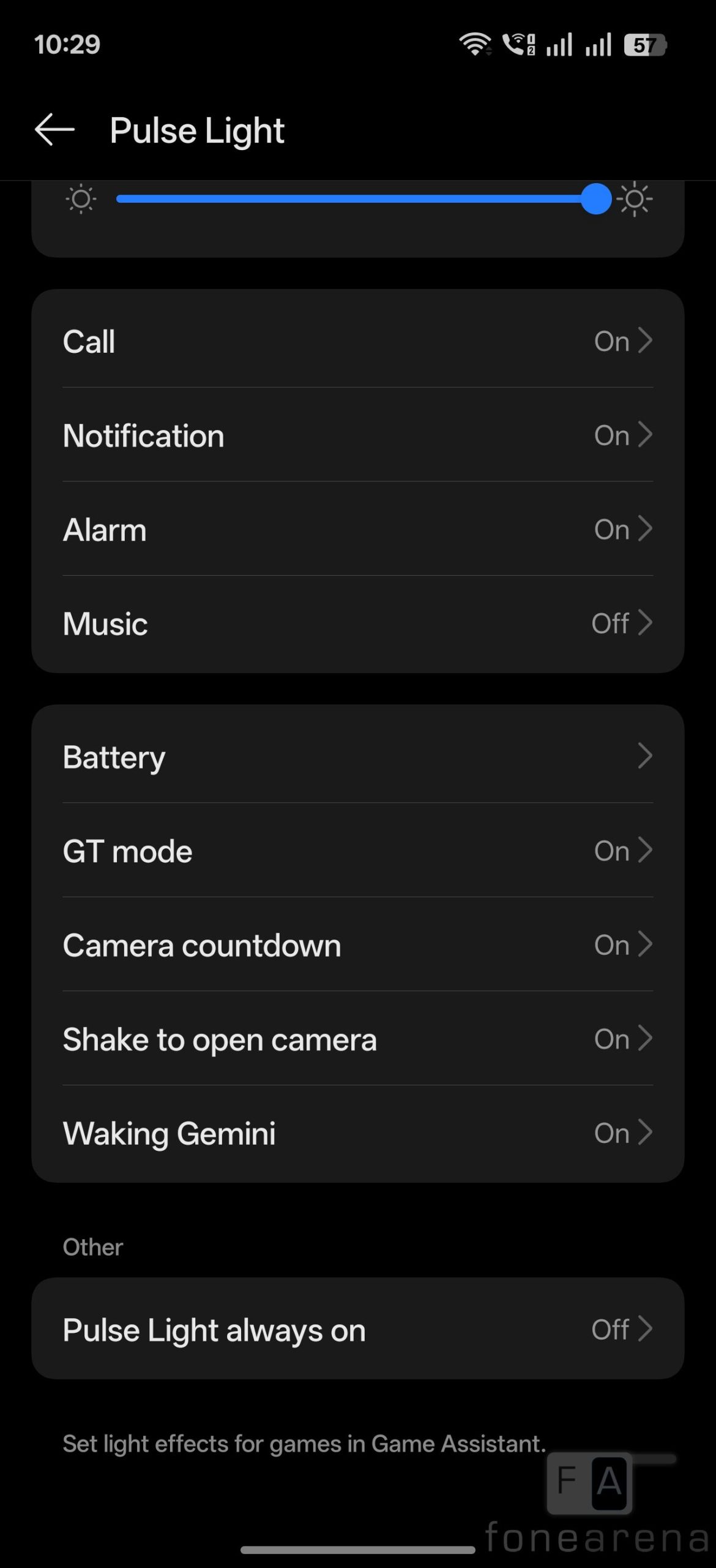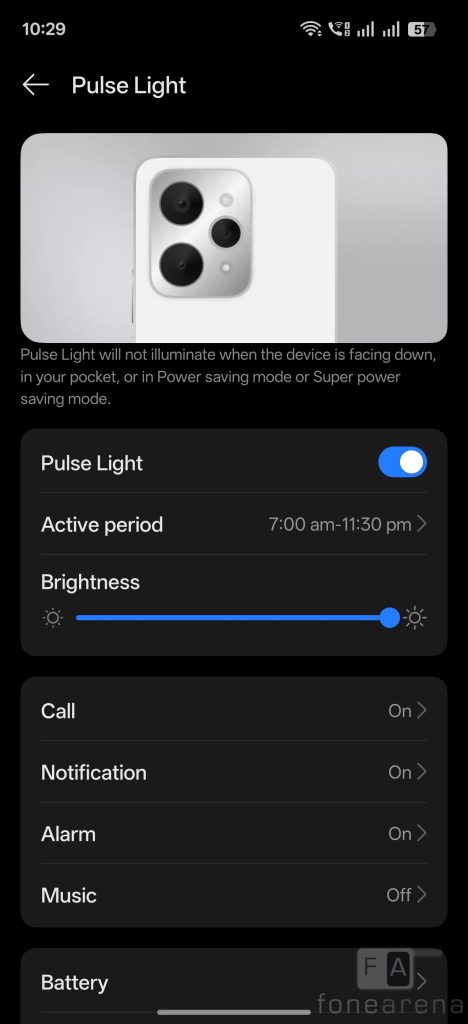 You can adjust the brightness of it, set active period, enable it for notification, alarm, music, battery, GT mode, camera timer, and also keep it always on along with speed of the breathing light. This is useful if you are a person who places the phone upside down.