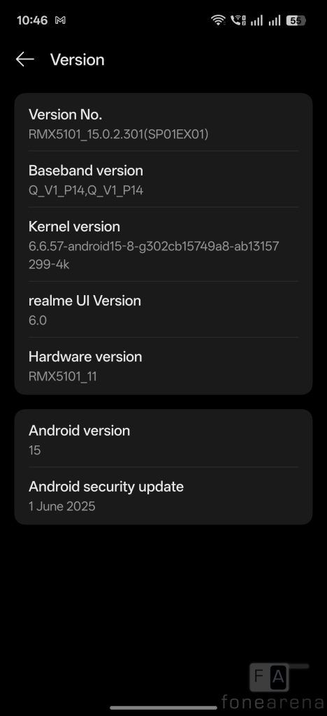 It runs Android 15 based realme UI 6.0 out of the box. It has Android security patch for June 2025. The phone should get 2 Android updates and 3 years of security updates, similar to other phones mid-range realme phones 3 Android updates and 4 years of security updates. realme UI 6.0 offers improved self-developed technology for smooth performance, and enhanced safety and privacy tools.