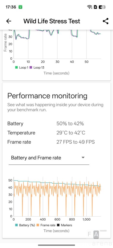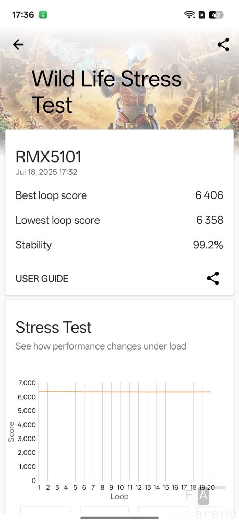 In 3D Mark wild life stress test, it scored 99.2% which is better than realme 14 Pro+. The temperature increased from 29 to 42 degrees, which is fine. That said, check out some synthetic benchmark scores below.