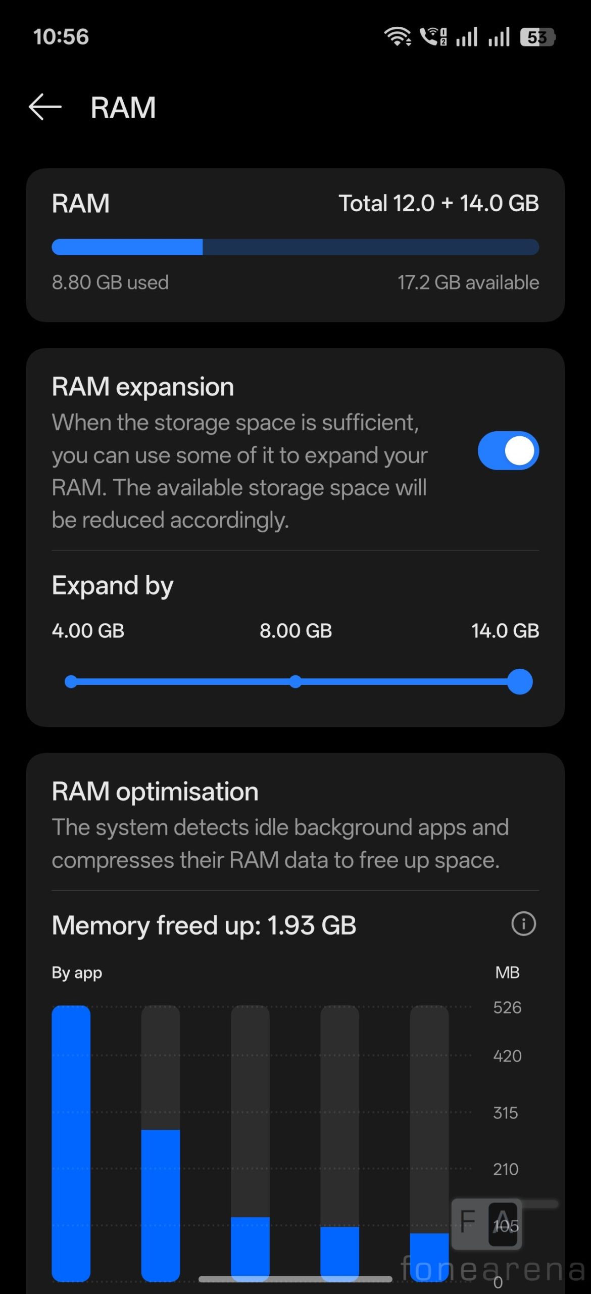 Out of 12GB LPDDR4X RAM, you get 11.02GB of usable RAM, and about 7GB of RAM is free when default apps are running in the background. It also has DRE or dynamic RAM expansion feature, which uses the built-in storage as RAM. This has up to 14GB of additional RAM expansion. Out of 256GB UFS 3.1, you get about 221.45GB of free storage.