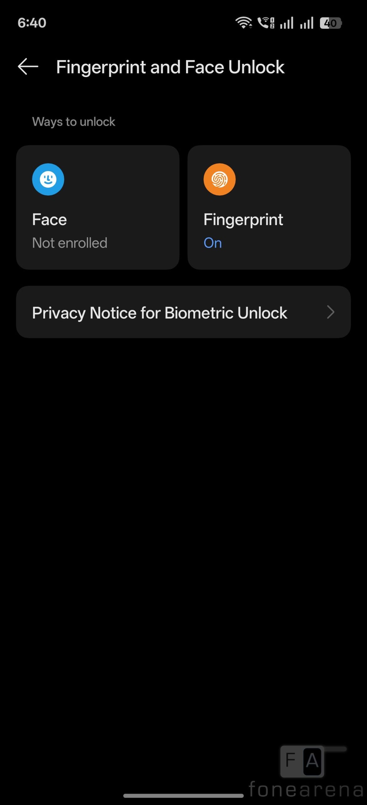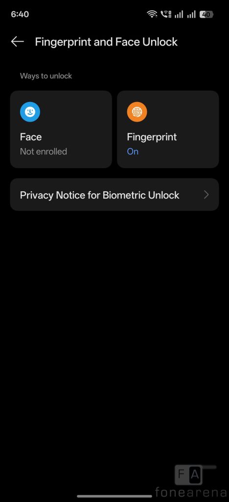 It has an in-display fingerprint sensor that unlocks the phone quickly, but it is not as fast as a physical fingerprint sensor. You can add up to 5 fingerprints. You can also use the fingerprint for app local and payments in apps. Furthermore, you can change the fingerprint animation and also disable it, and also enable quick launch option to launch apps directly from the lock screen by holding the fingerprint. The phone also has face unlock feature.