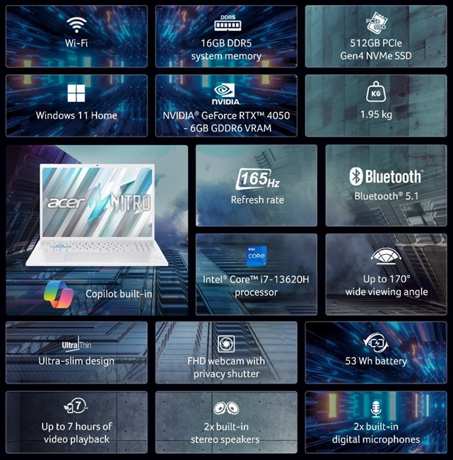 Acer states that the Nitro Lite 16, weighing 1.95 kg and measuring 22.9 mm in thickness, ranks among the lightest 16-inch laptops built for performance. It is powered by a 53Wh battery, includes a 100W USB-C charger, and utilizes Intel Thread Director technology for efficient hybrid performance management.