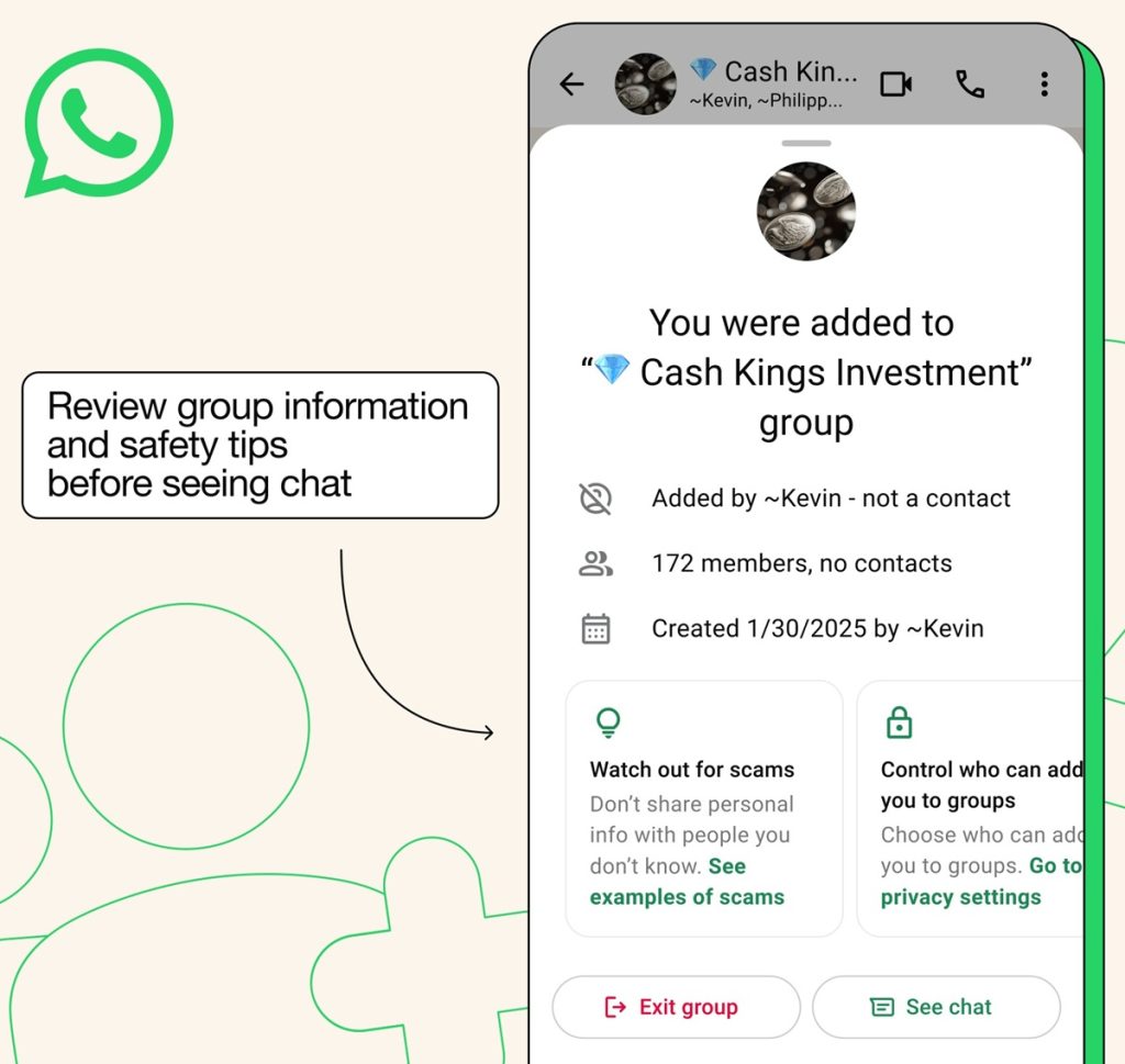 - Group Safety Prompts: If someone unknown adds you to a group, WhatsApp displays a safety prompt with information about the group and safety tips. You can choose to leave immediately or stay and view more context. Notifications remain muted until you decide to stay.