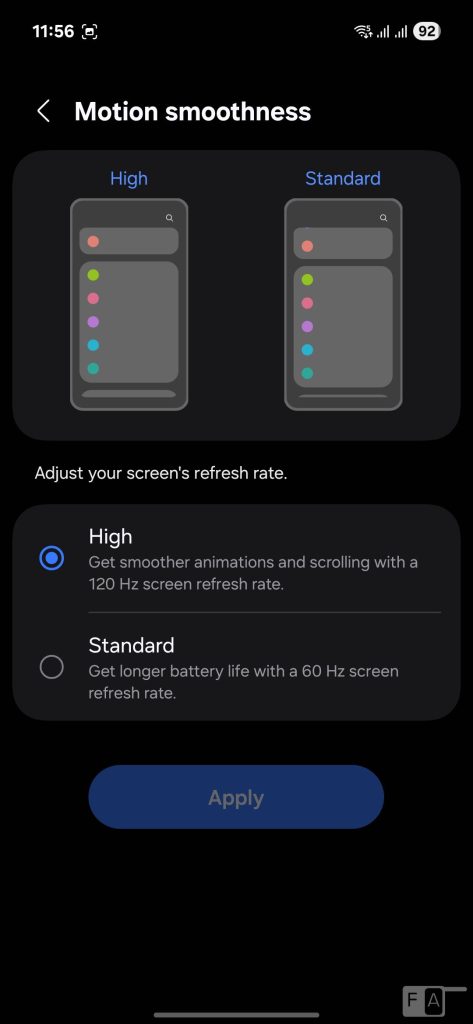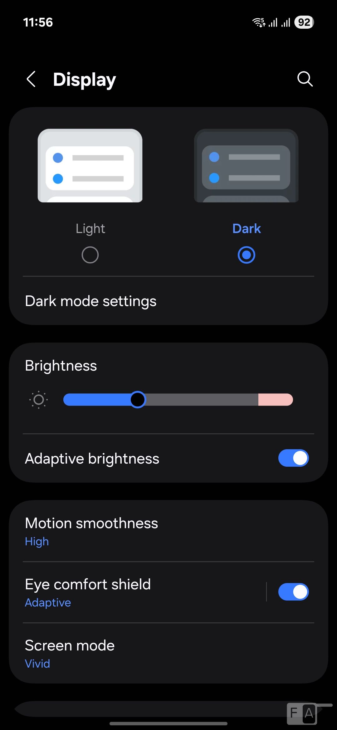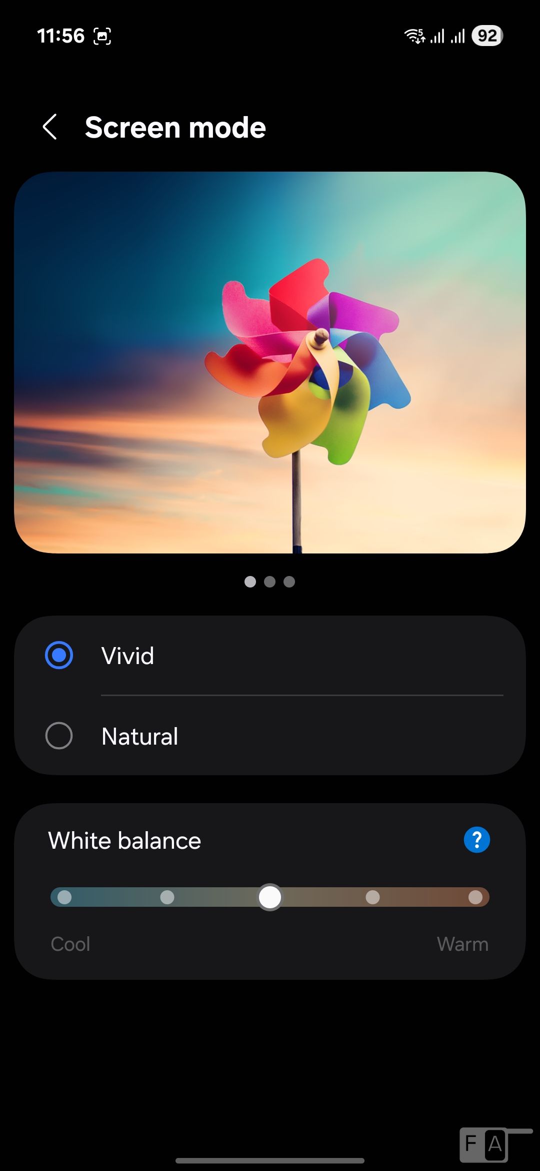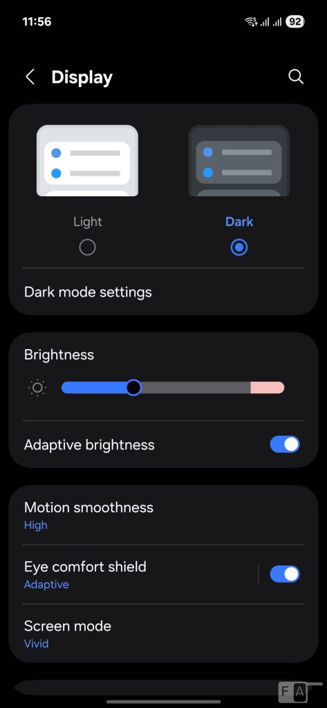It has a 120Hz refresh rate screen that offers a fluid user experience with smoother animations, scrolling and gaming. Similar to the other Samsung phones, there is an Eye comfort shield that limit blue light emitted by the screen. There is also dark mode, which looks great on the AMOLED screen. You can choose from Vivid or Natural screen modes based on your preference, or set the white balance manually. The phone doesn’t have DC dimming or low brightness anti-flicker mode that is present in some AMOLED screen phones in the price range. I didn’t notice any screen flicker issues in low brightness on the phone. It doesn’t have notification LED, but there is Always on display.
