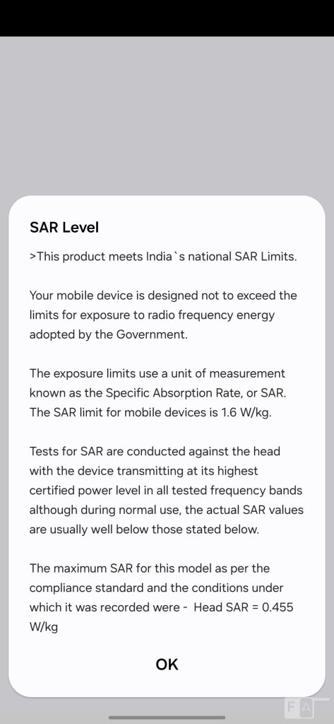 The Galaxy M36 5G’s head SAR is at 0.455/Kg which is less than the M35 5G, and is well under the limit in India which is 1.6 W/kg (over 1 g).