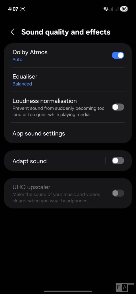 YouTube Music is the default music player. It has equalizer, Dolby Atmos, UHQ upscaler, and Adapt that can be enabled from the settings. All these improve the audio when listening through earphones, and Dolby Atmos also works with speakers. It doesn’t have FM Radio support. That said, audio through earphones is good. Loudspeaker output from the stereo speakers is decent since the bottom speaker is dominant.