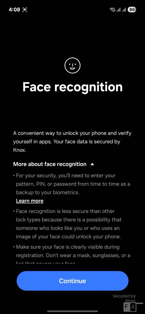 Even though the phone an AMOLED screen, it still has a side-mounted fingerprint scanner. You can add up to 3 fingerprints, and adding fingerprint is easy. It has support for Face recognition, which doesn’t work well if the lighting is poor in the room, if you are hats, or use heavy makeup. Both these are protected by Knox security.