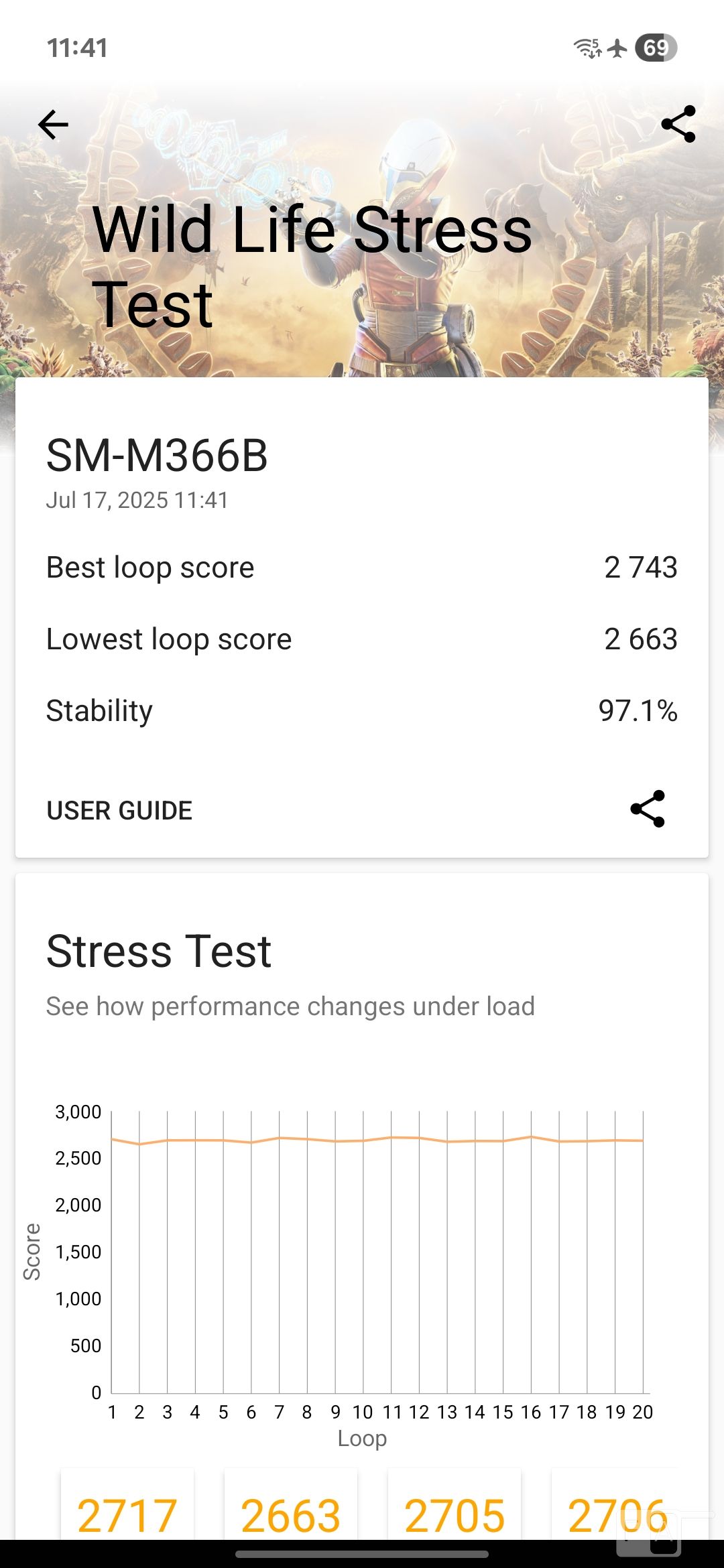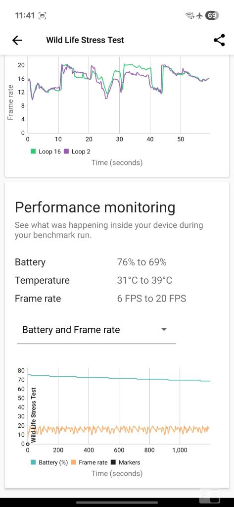 In 3D Mark wild life stress test, it scored 97.1% which is good, and the temperature shot up from 31 to 39 degrees. That said, check out some synthetic benchmark scores below.