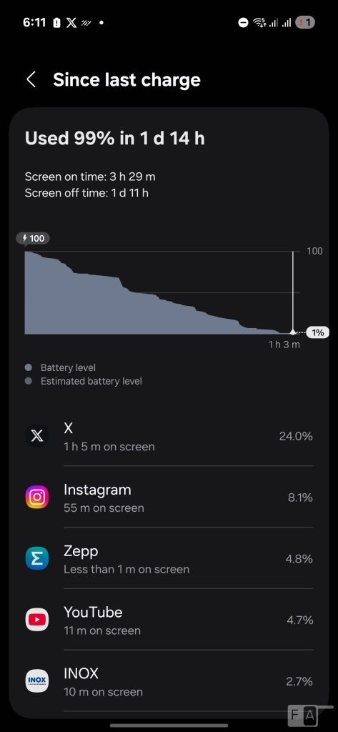 The Galaxy M36 5G has a 5000mAh battery compared to 6000mAh in the M35. I got about 3.5 hours of screen on time mostly on Wi-Fi and occasionally on 5G with 1 day of use in 120Hz refresh rate. The SoT is slightly less than the M35. It should last for a day easily, for average use and less than that for heavy use.