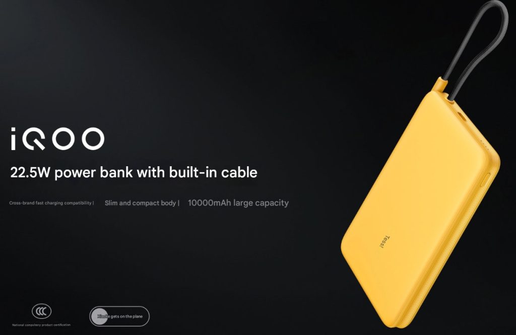 The iQOO 22.5W power bank with built-in cable comes in Starry Yellow color, has a slim and compact body about 1.5cm thick and weighs about 181g, and an integrated fast charging cable with an L-shaped rechargeable C-port design.