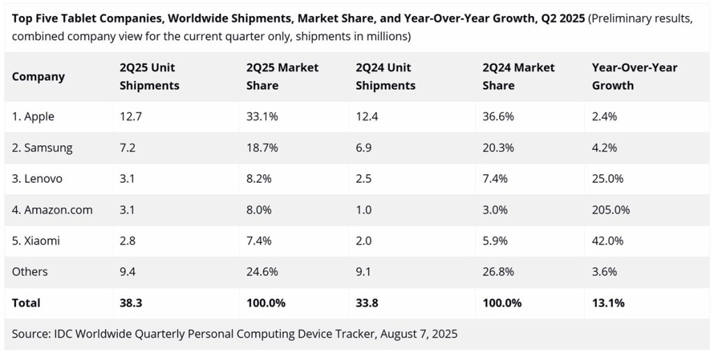 Worldwide tablet shipments increased by 13.1% year-over-year in the second quarter of 2025 (2Q25), reaching a total of 38.3 million units, as reported by the International Data Corporation (IDC) Worldwide Quarterly Personal Computing Device Tracker.