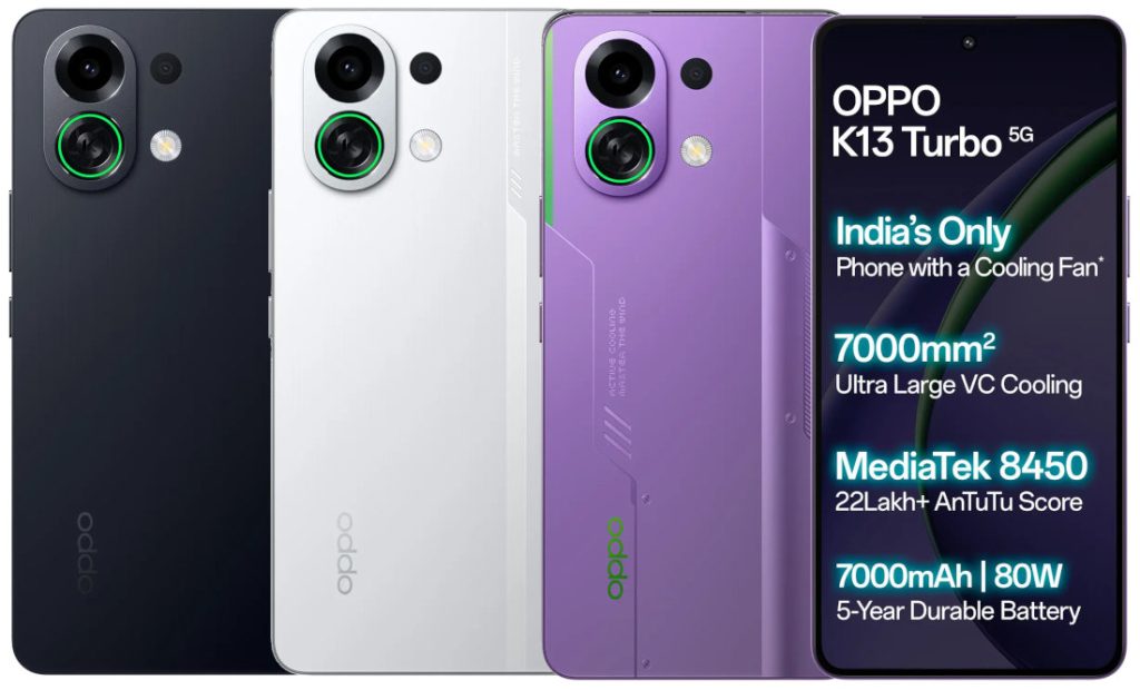 The OPPO K13 Turbo comes in Midnight Maverick, White Knight and Purple Phantom colours and is priced at Rs. 27,999 for the 8GB + 128GB version, and the 8GB + 256GB version costs Rs. 29,999.