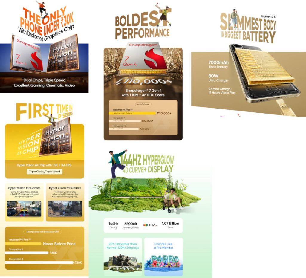 realme P4 – Metal Heart Design: The realme P4 adopts an industrial aesthetic characterized by metallic lines and an exposed screw detail. This model is designed to convey durability and style. It will be offered in three color variants: Steel Grey, Engine Blue, and Forge Red.