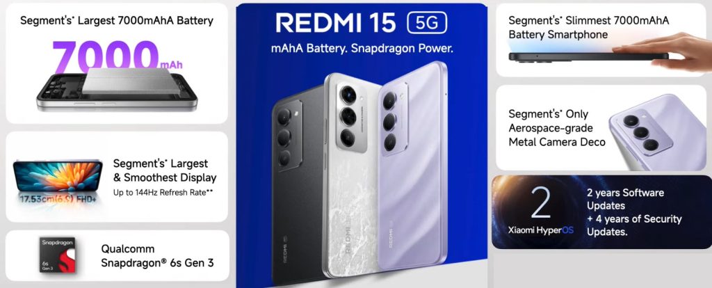 The REDMI 15 5G is powered by Snapdragon 6s Gen 3 SoC with up to 8GB of RAM and up to 8GB of virtual RAM. It has a 50MP rear camera, along with a secondary camera, and has a 8MP front camera. The phone runs Android 15 with HyperOS 2 on top. It will get 2 Android OS updates and 4 years of security updates.