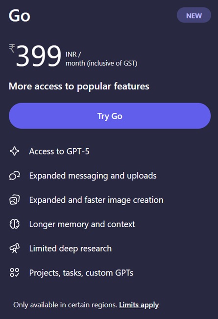 ChatGPT Go is available in India for Rs. 399 per month, with automatic monthly billing that can be canceled at any time. Payments can be made via credit cards or UPI.