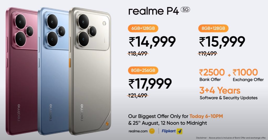 | realme P4 | 8GB + 256GB | ₹21,499 | ₹2,500 Bank Offer + ₹1,000 Exchange Offer | ₹17,999 |