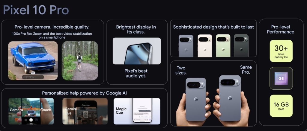 - 16GB LPDDR5X RAM, 128GB UFS 3.1 (Pixel 10 Pro only) / 256GB / 512GB / 1TB UFS 4.0 storage