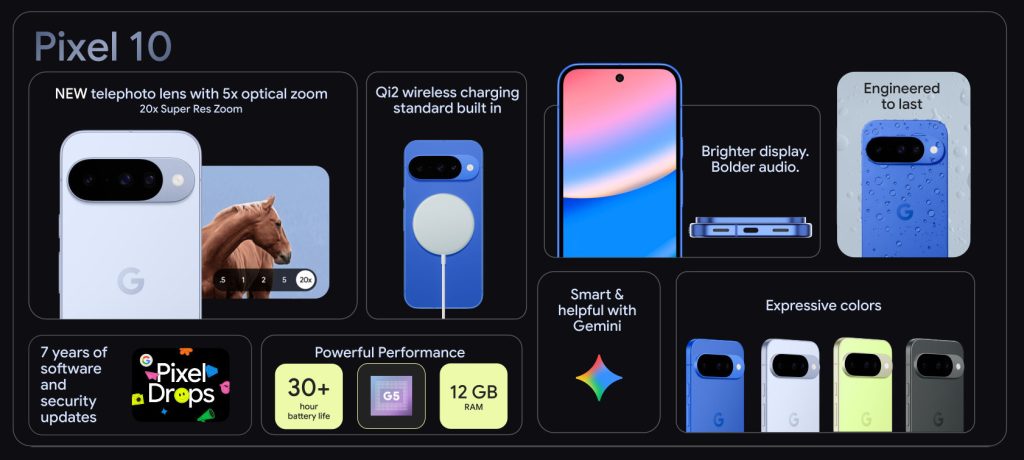 The Pixel 10 Pro series also vapor chamber cooling. These run Android 16, and will get Android and security updates for 7 years. The Pixel 10 series feature Satellite SOS in the US.