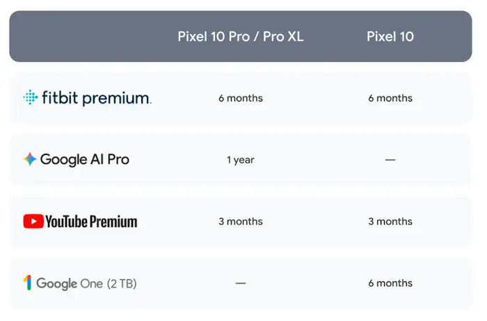 The Pixel 10 Pro models come with a one-year subscription to the Google AI Pro plan, like the last time. The Pixel 10 comes with Google One (2TB) subscription for 6 months. All the models come with six months of personalised fitness support with Fitbit Premium and three months of ad-free YouTube Premium (new users only).