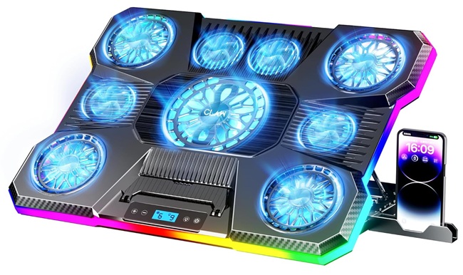 It features RGB lighting and an LCD display with a control panel for fan speed and lighting adjustments. The pad provides nine levels of height adjustment, USB 2.0 and USB-C ports, and a right-side mobile holder, making it suitable for gaming, video editing, and software development.