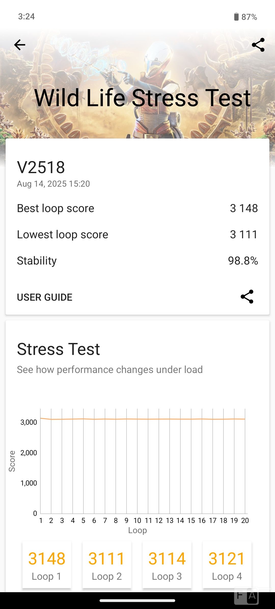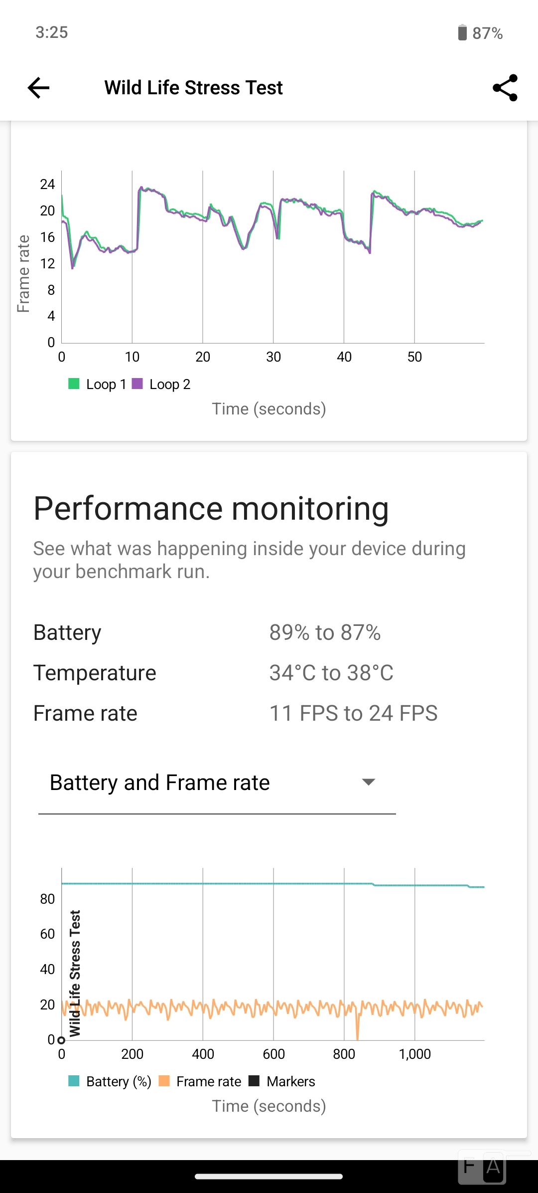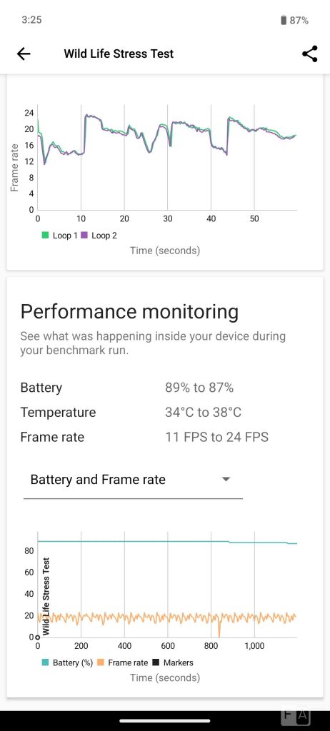 In a 3D Mark wildlife stress test, it scored 98.8% which is good. The temperature increased from 34 to 38 degrees, which is not much. That said, check out some synthetic benchmark scores below.