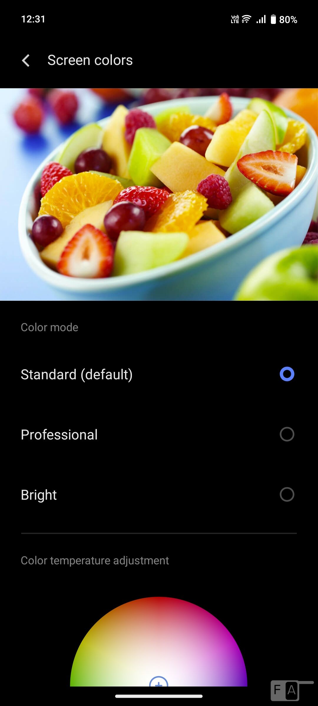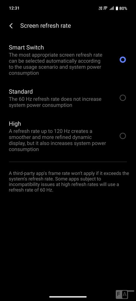 The 120Hz refresh rate offers a smooth user experience, especially when you are scrolling through the UI and when gaming. You can select from standard (default), professional, and bright screen colour modes. You can select smart switch or force it to 60Hz or 120Hz.