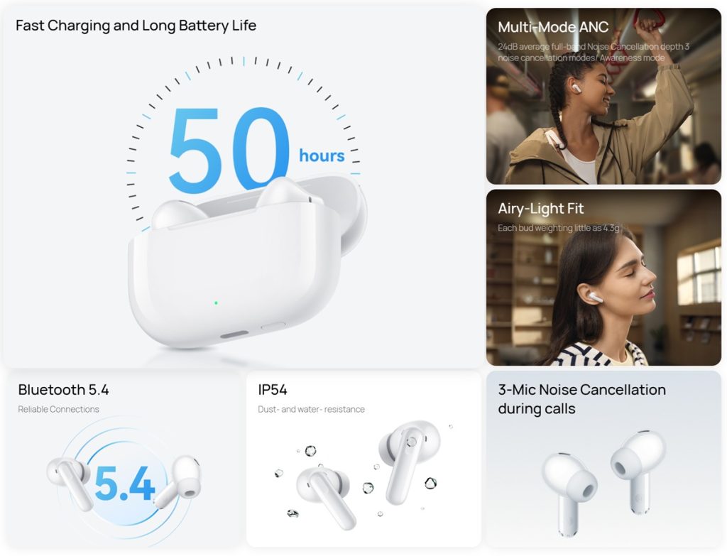 The earbuds support Bluetooth 5.4 and feature a 10 mm dynamic driver unit. Equipped with ANC, the earbuds provide Ultra, General, and Cozy modes that cut noise by up to 24 dB, and three directional mics ensure calls remain crisp by filtering surrounding sounds.
