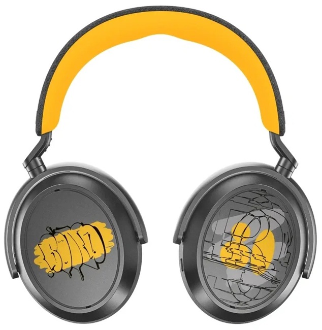 - Left earcup: a vibrant “throwie”-style tag set on a dynamic backdrop.