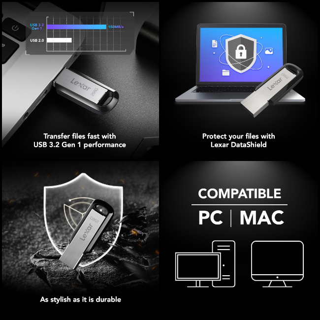For security, the drive includes Lexar DataShield, a password protection feature that helps safeguard files from unauthorized access. It supports both PC and Mac systems and is backward-compatible with USB 2.0 devices for wider usability.