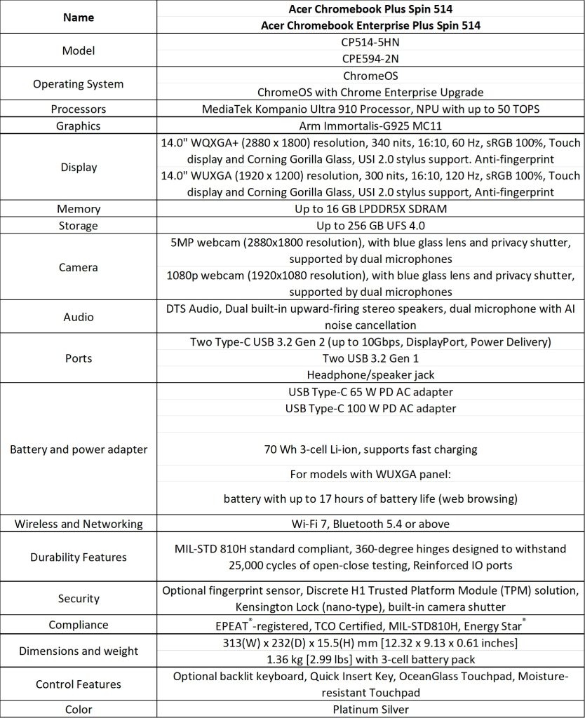 The Chromebook Plus Spin 514 is a convertible laptop powered by the MediaTek Kompanio Ultra processor with a 50 TOPS AI engine for offline AI tasks. It has an Arm Immortalis-G925 GPU and offers up to 17 hours of battery life.