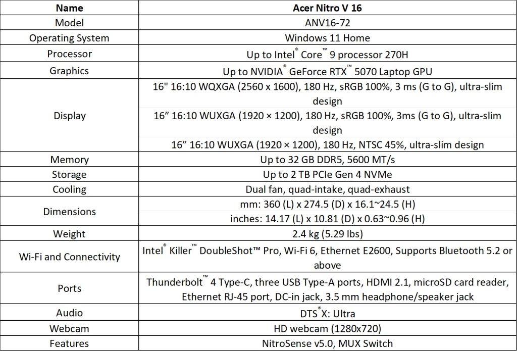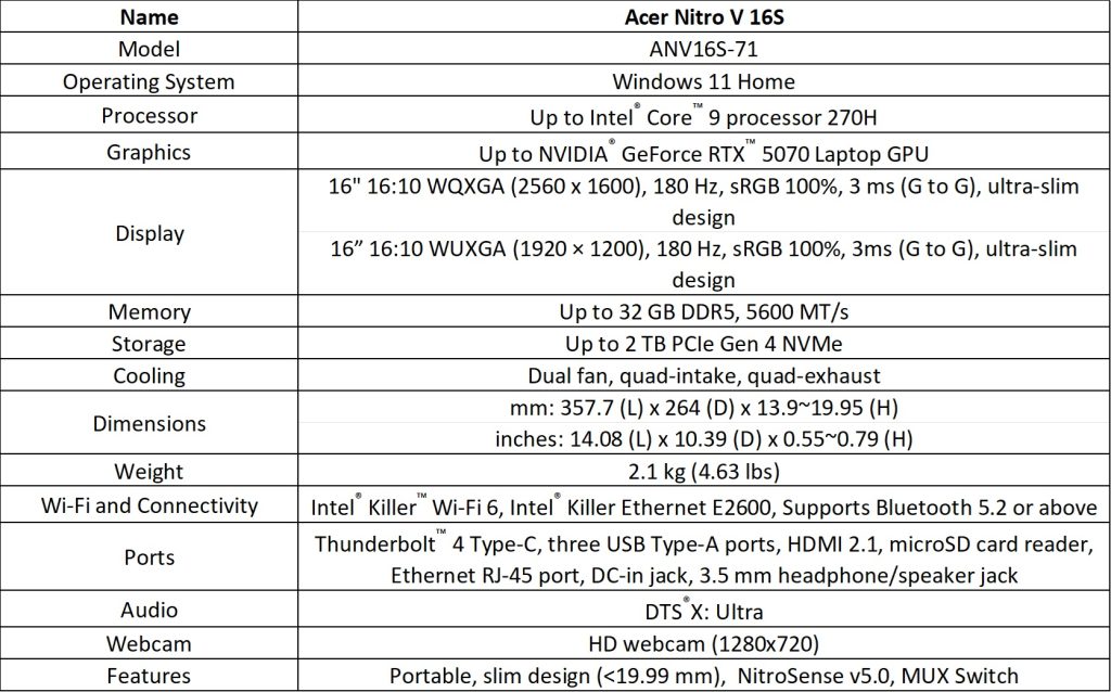 - Acer Nitro V 16S (ANV16S-71): USD 1,099.99 / EUR 1,399 (Rs. 96,840 approx.) – North America, November 2025; EMEA, November 2025.