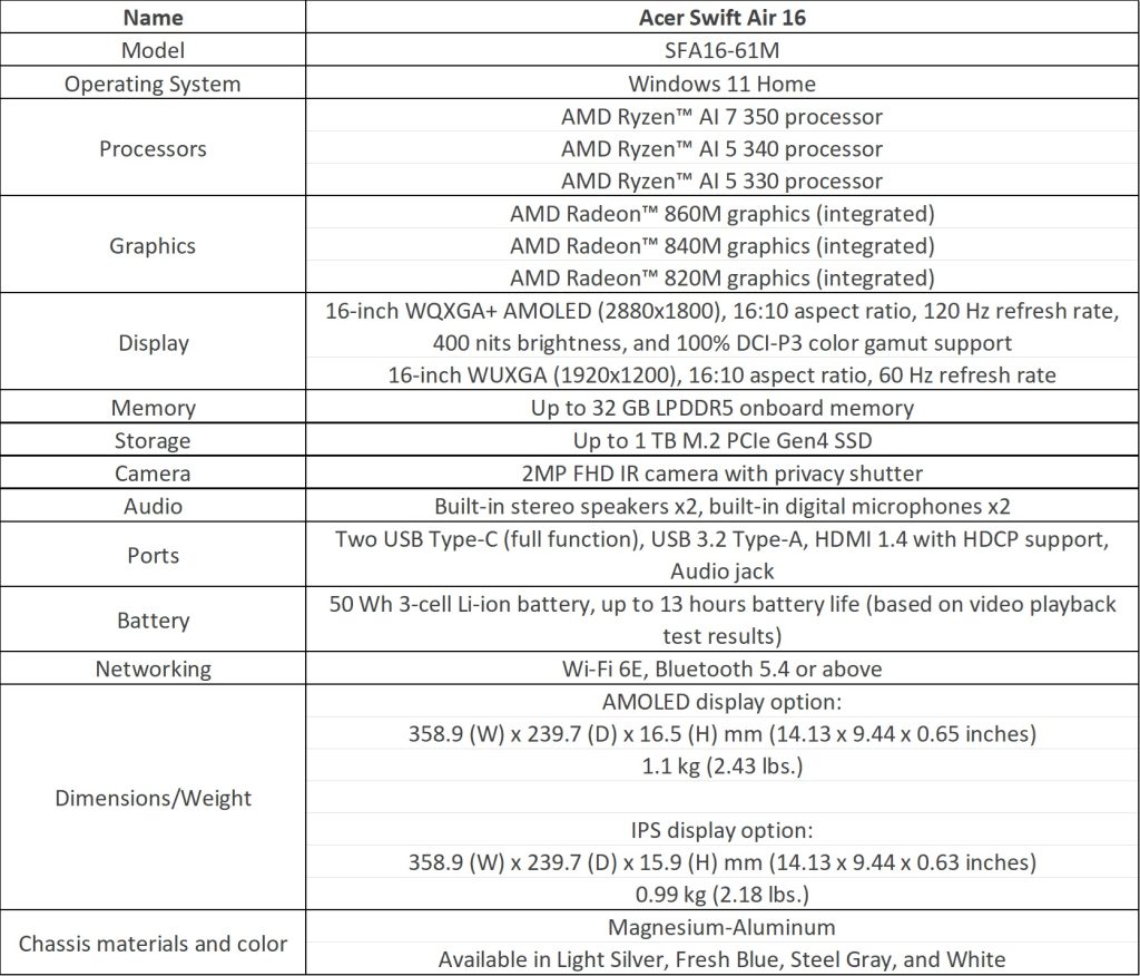 The Swift Air 16’s magnesium-aluminum design keeps it under 1 kg, while AMD Ryzen AI 300 Series processors up to AI 7 350 enable local AI tasks, complemented by Copilot+ functions like Recall, Click to Do, and improved Windows Search.