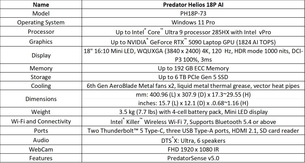 The Predator Helios 18P AI packs Intel Core Ultra 9 285HX (vPro), NVIDIA GeForce RTX 5090, up to 192 GB ECC RAM, and 6 TB PCIe Gen 5 SSD, with dual AeroBlade 6th Gen fans and liquid metal for cooling.