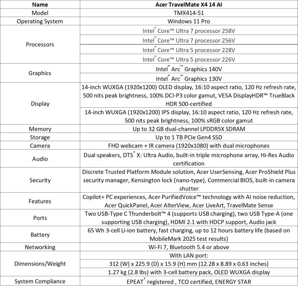Running on Intel Core Ultra 7 258V with 32 GB LPDDR5X memory and 1 TB PCIe storage, the TravelMate X4 14 AI supports Windows 11 Pro and Copilot+ features such as Recall, Click to Do, Cocreator, and Live Captions.