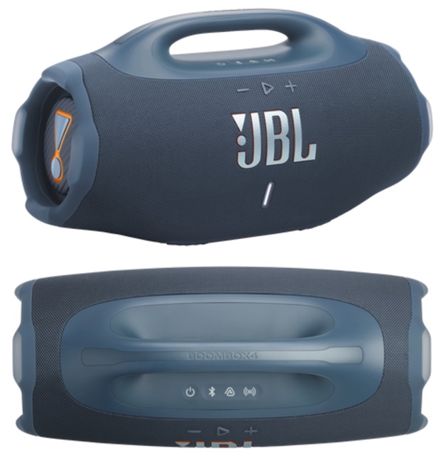 Its audio construction includes a third passive radiator and two mid-range drivers replacing the subwoofer. Playback reaches up to 28 hours, extendable to 34 hours with Playtime Boost, and the battery is replaceable. The Boombox 4 is IP68 water and dustproof and supports Auracast multi-speaker pairing and USB-C lossless audio.