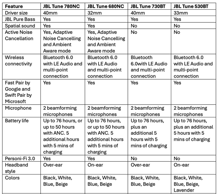Quick specs – (JBL Tune 780NC / 680NC / 730BT / 530BT)