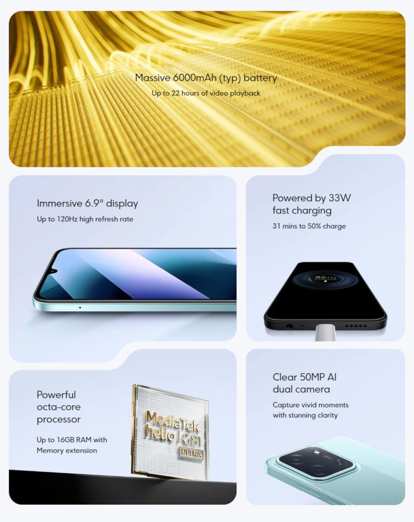 - Octa Core MediaTek Helio G81-Ultra processor (Dual 2GHz Cortex-A75 + Hexa 2GHz 6x Cortex-A55 CPUs) with ARM Mali-G52 2EEMC2 GPU