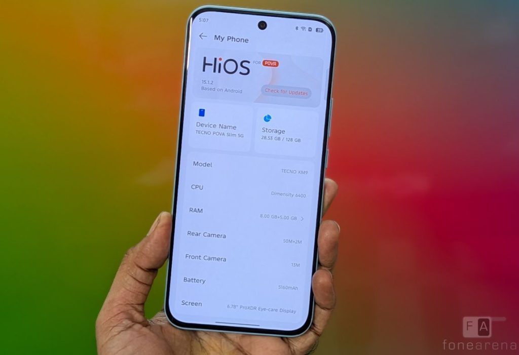 Under the hood, the TECNO Slim 5G is powered by the Dimensity 6400 chipset. It has support for several 5G bands, has 8GB of LPDDR4X RAM and 128GB storage. For connectivity, there is 5G+ Carrier Aggregation, 4×4 MIMO, Dual SIM Dual Active, and TÜV Rheinland High Network Performance certification.
