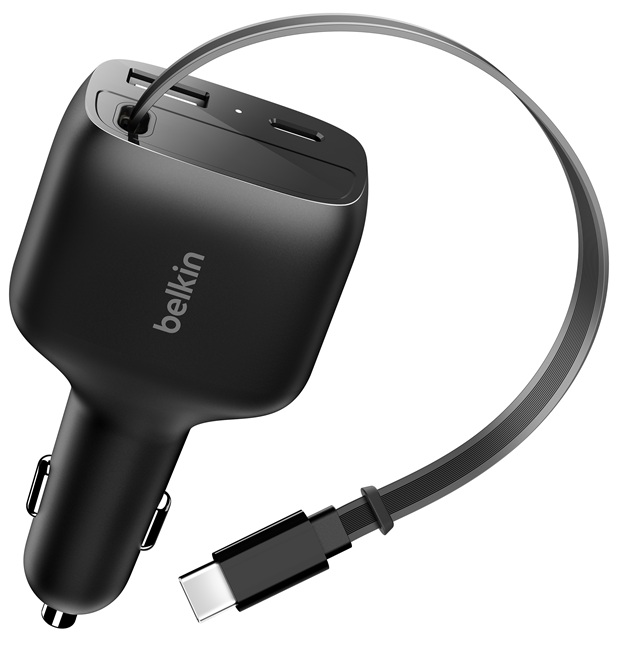 This in-car charger provides 75W of total output, split across a retractable 75cm USB-C cable that supports up to 60W, and two additional ports (USB-C and USB-A). Intelligent Power Allocation automatically distributes wattage between devices. USB-C PD compatibility allows rapid charging for iPhones, Galaxy phones, and laptops.