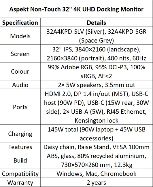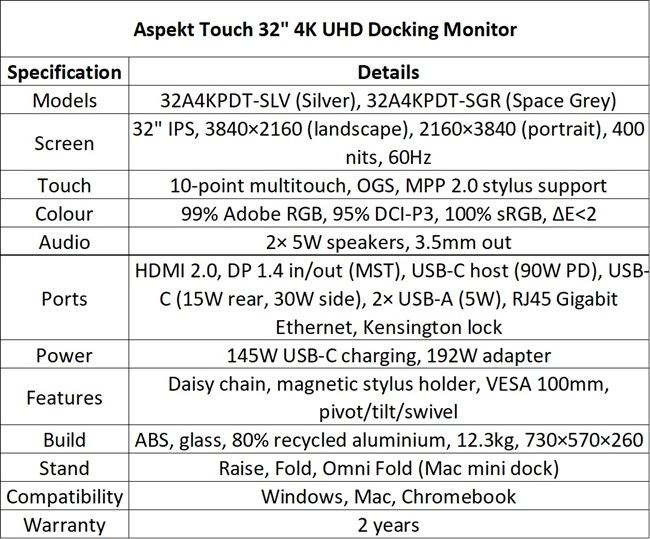 The 32-inch Aspekt UHD 4K Docking Monitor comes in touch and non-touch variants with anti-glare or gloss finishes. Each unit supports 145W USB device charging, Gigabit Ethernet, and multi-monitor daisy-chaining. Side USB ports allow fast peripheral data transfer, while magnetic cable management in Aspekt Fold and Omni Fold stands keeps workspaces organized.