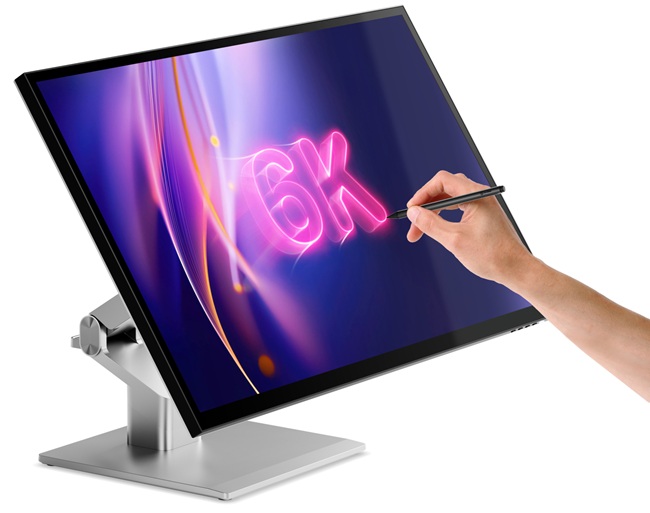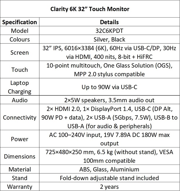 The Clarity 6K Touch is the first 6K touchscreen for Mac and Windows, featuring a 32-inch 6016×3384 display with 99% Adobe RGB/DCI-P3 coverage and Avg. Delta E <1. It supports 90W laptop charging and 10-point multitouch with MPP 2.0 stylus compatibility.