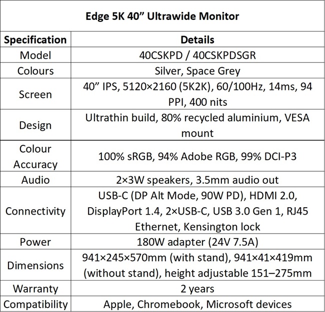 The Edge 5K Ultrawide offers a 40-inch 5120×2160 display with 100Hz refresh rate and 400 nits brightness. A built-in 90W Power Delivery USB-C hub integrates workstation functionality into a sleek aluminium-and-glass frame.